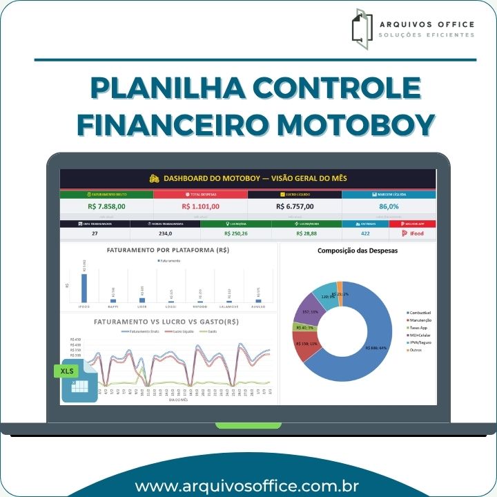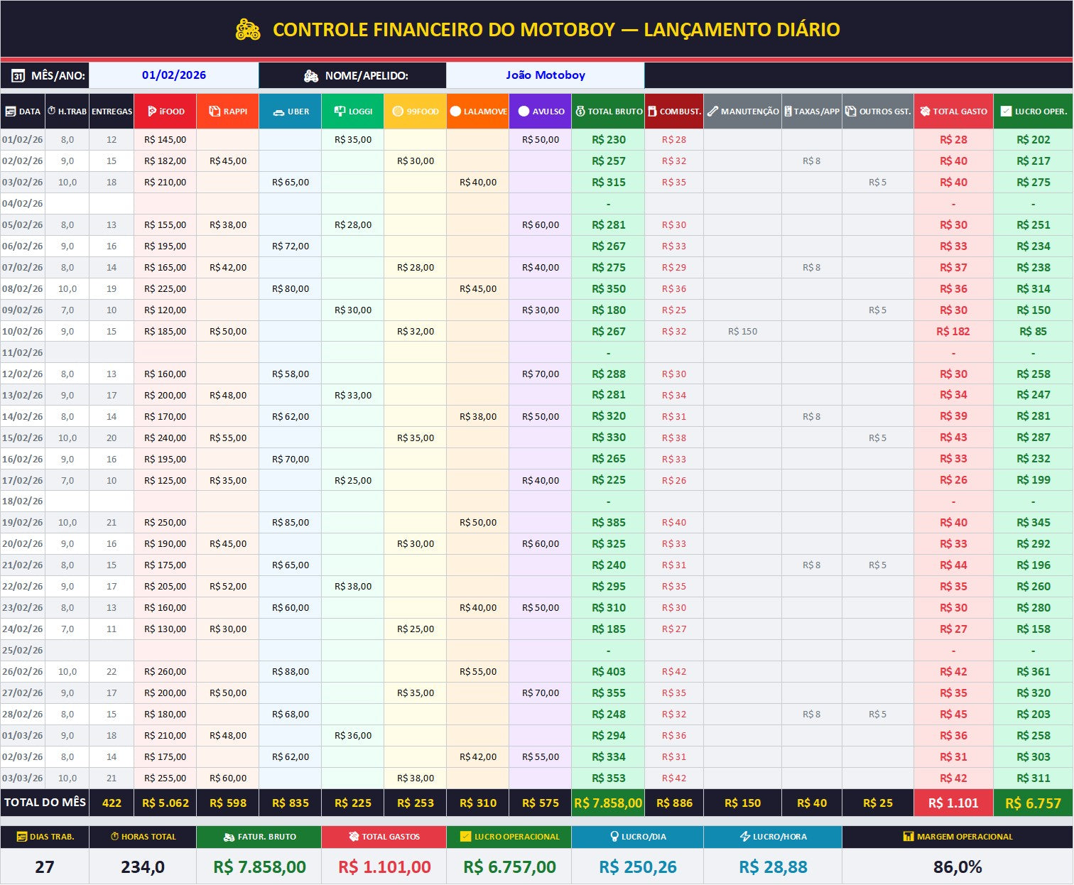Foi pensando exatamente nessa necessidade que desenvolvemos a Planilha de Controle Financeiro para Motoboy. Simples, altamente eficiente e totalmente pronta para uso direto no seu Excel. Basta dedicar alguns minutos do dia para preencher seus ganhos (avulsos ou via apps) e seus gastos, e o sistema inteligente calculará tudo para você automaticamente.
